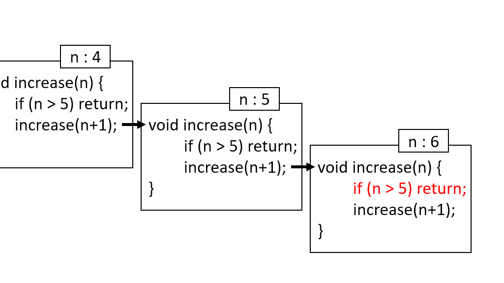 increase(n + 1); // n을 1 증가시키면서 재귀적 실행