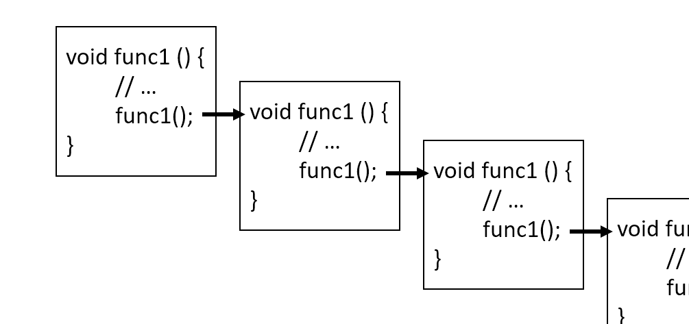 한 함수를 실행하던 도중 다른 함수를 실행하면, 실행한 함수가 종료되기 전까지 기존에 실행하던 함수는 종료되지 않는다. 자기 자신을 호출하는 함수이기 때문에 무한루프가 걸릴 수 있다는 문제점이 있다.