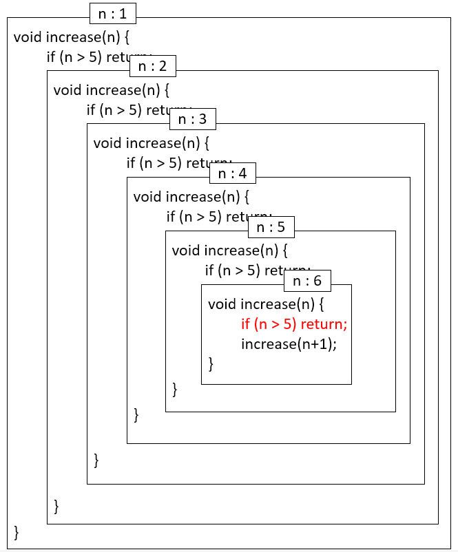 increase 함수가 n 이 1인 상태에서 시작해서, n을 1 증가시킨 값으로 자기 자신을 호출하며 계속 함수를 호출한다.