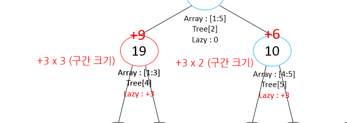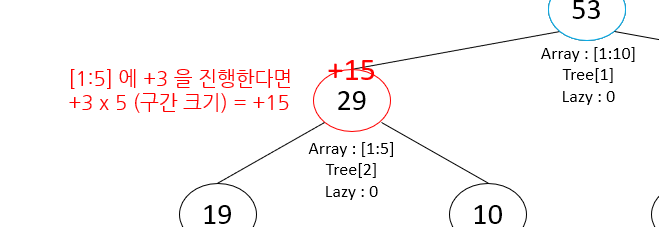 트리 탐색 중 업데이트해야 하는 구간의 노드를 발견했다. 이때 이 구간에 모두 업데이트를 진행했다고 가정하고 결과 값을 구해야 한다! [1:5] 구간은 5개의 수를 가리키고 있기 때문에, 이 구간에 +3을 진행한다면 이 구간의 합은 기존보다 +15가 증가하게 된다!