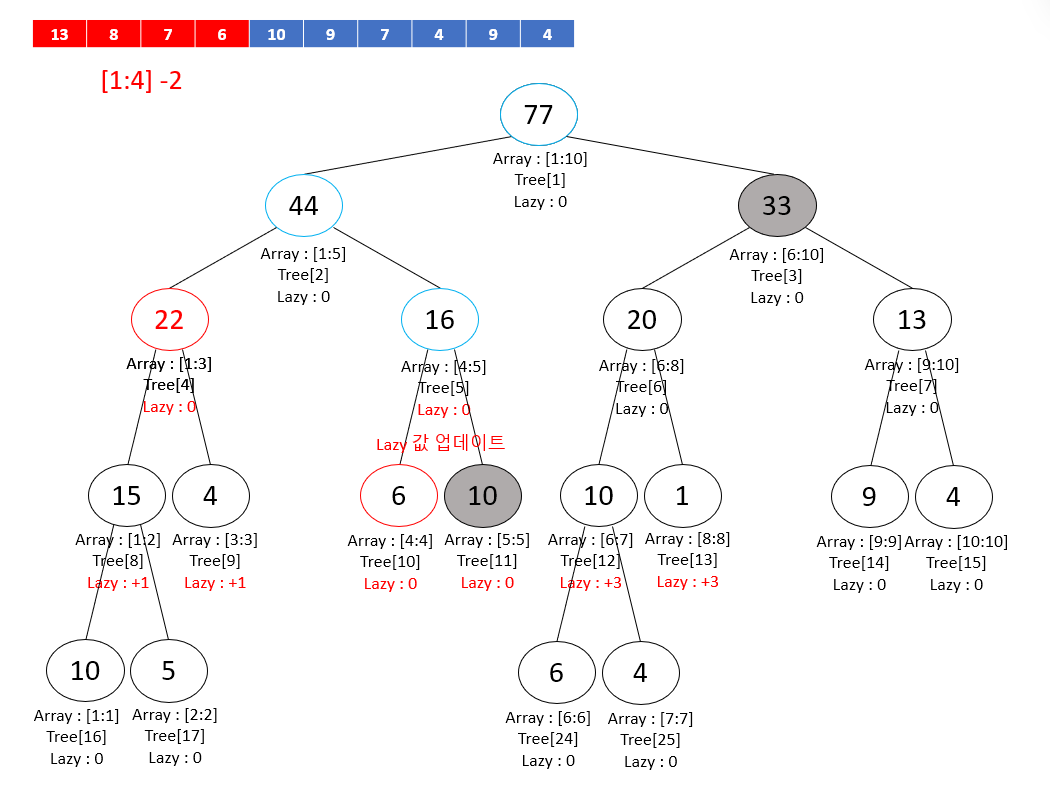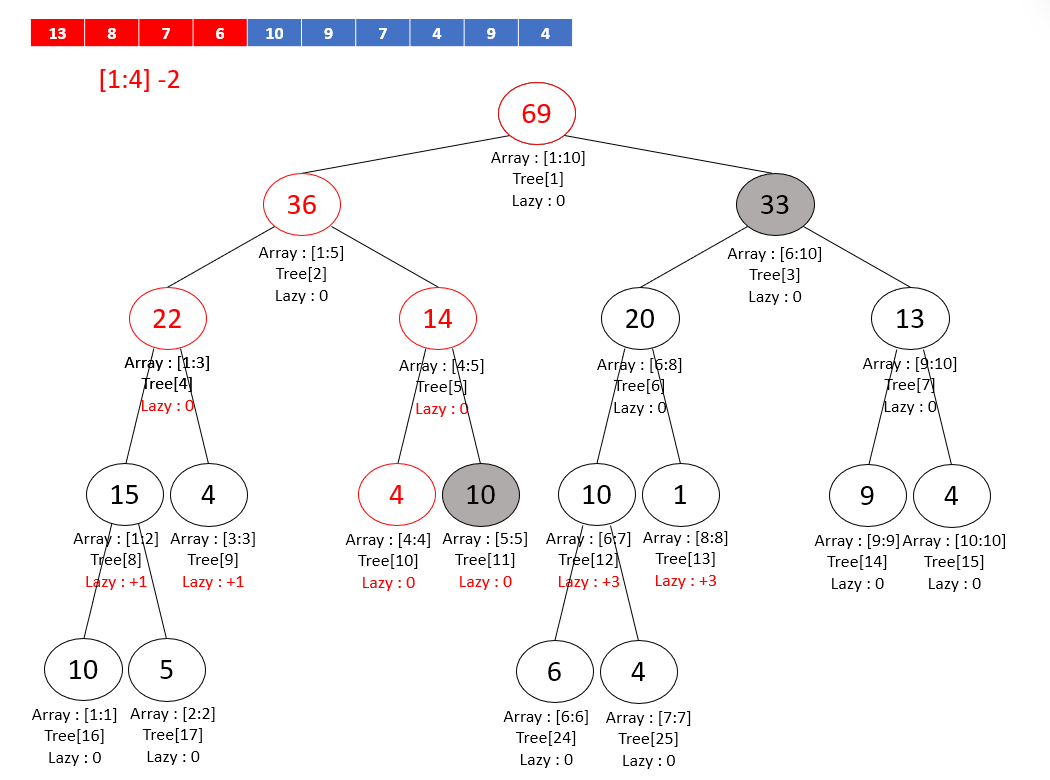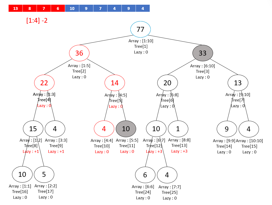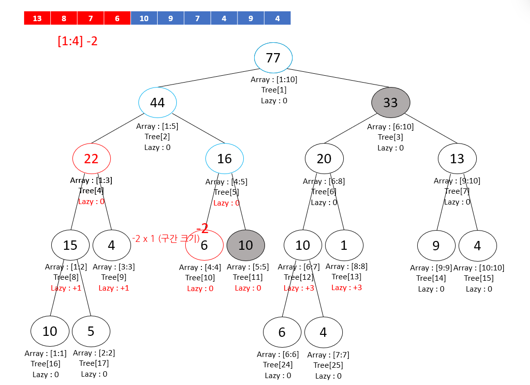 따라서 lazy 값을 +3으로 가지고 있던 4번 노드의 자식 노드들은 -2 업데이트로 인해 lazy 값이 +1이 된다.