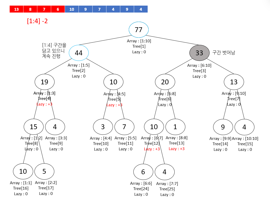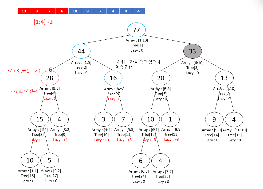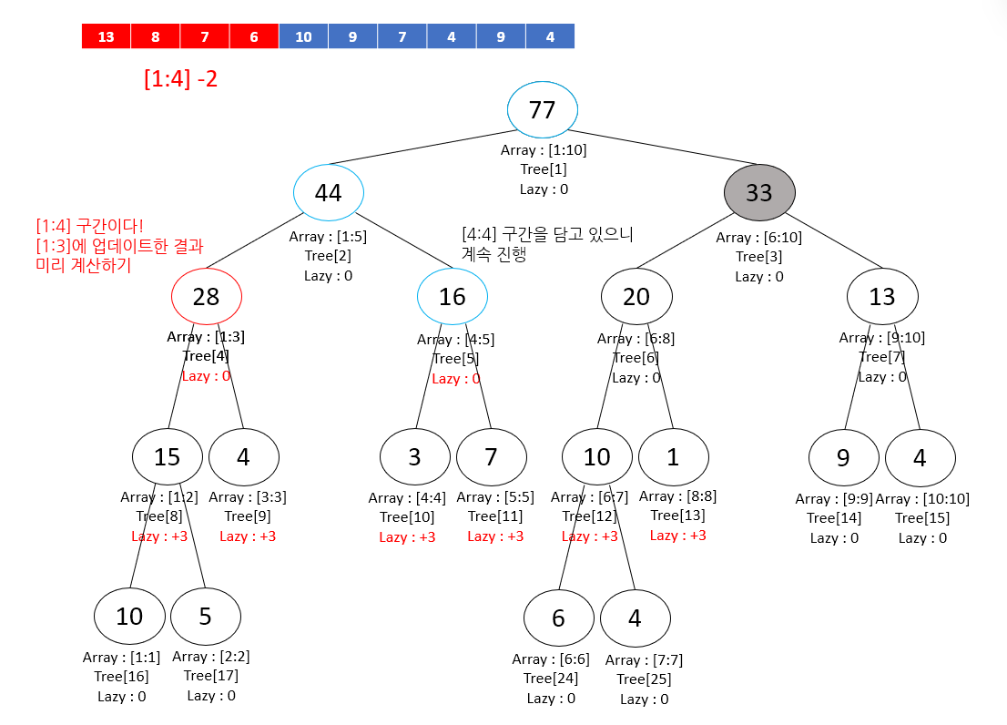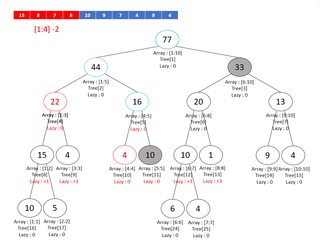 따라서 lazy 값을 +3으로 가지고 있던 4번 노드의 자식 노드들은 -2 업데이트로 인해 lazy 값이 +1이 된다.