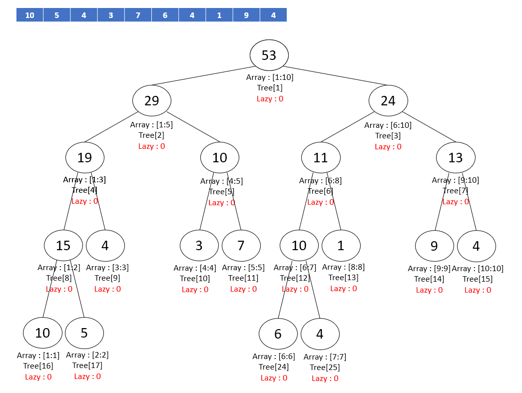 게으르게 전파되는 특징을 가진 Lazy 값을 이용하여 직접 접근하지 않는 구간에는 나중에 직접 접근할 때 값을 업데이트해주는, 특정 구간에 대한 업데이트를 유리하게 진행할 수 있는 아이디어를 Lazy Propagation in Segment Tree (느리게 갱신되는 세그먼트 트리) 라고 한다. 기본적인 트리 구성은 세그먼트 트리와 동일하고, Lazy 값이 추가되었다.