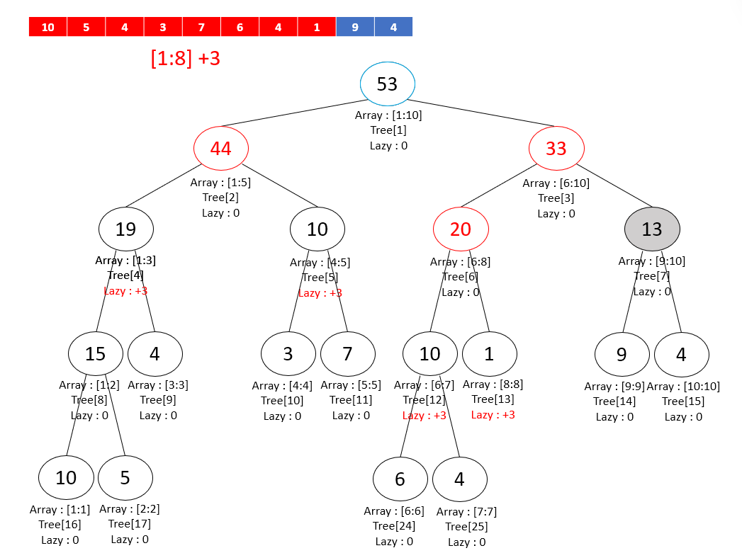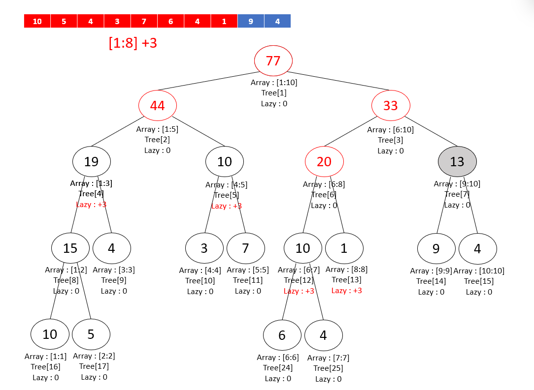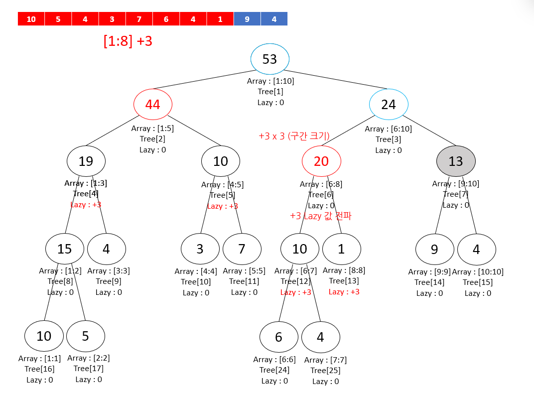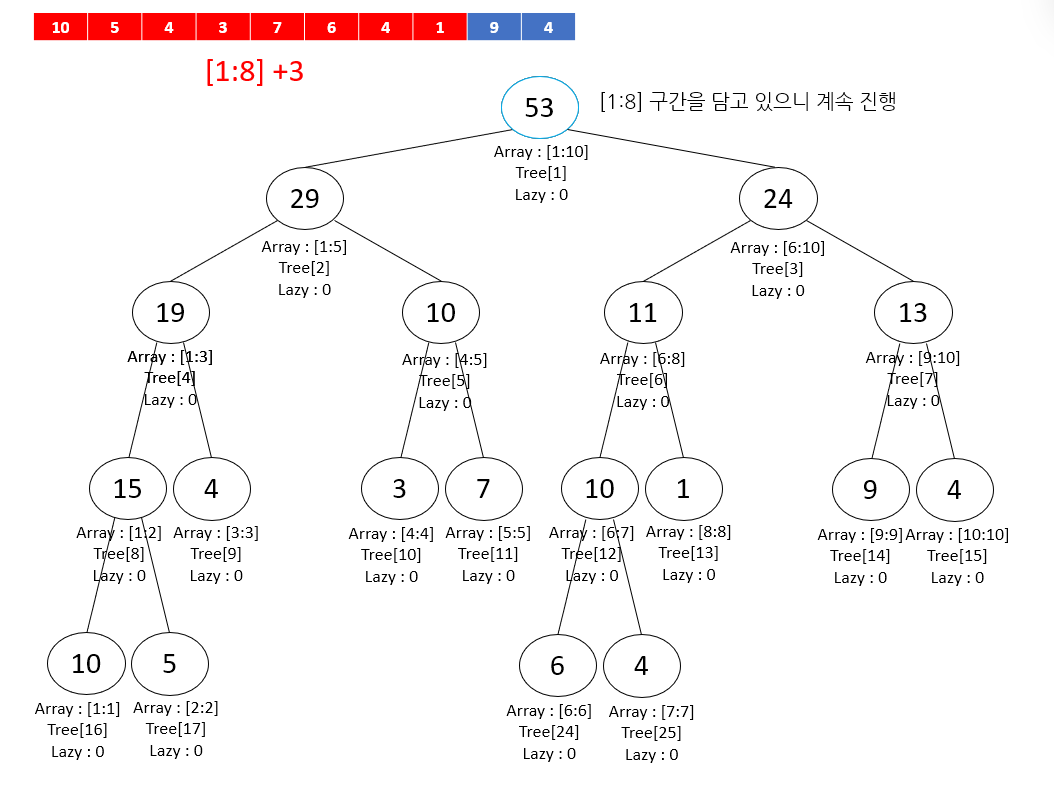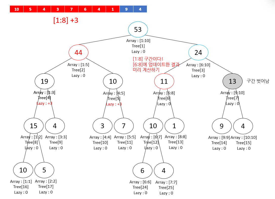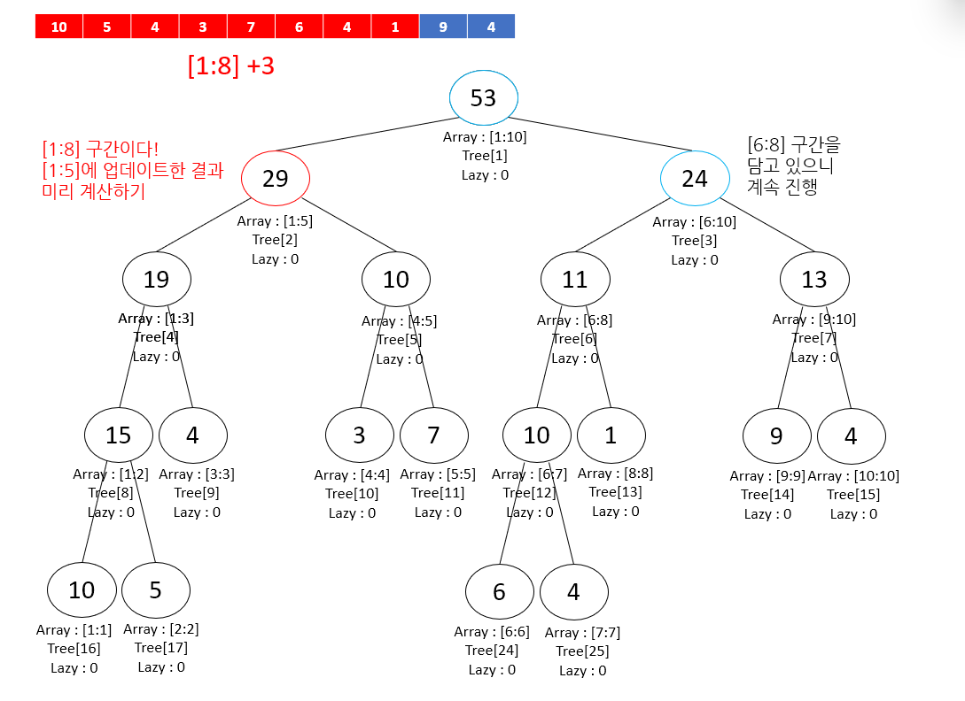 이렇게 Lazy 값만 전파해두고, '나중에 이 내부 구간 필요할 때 업데이트할게~' 라며 탐색을 종료하고 루트 노드로 되돌아간다. 다른 구간도 업데이트를 이어서 진행해 주자.