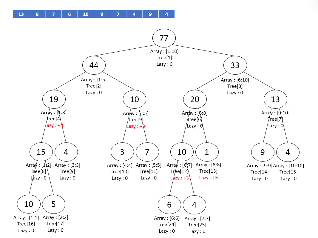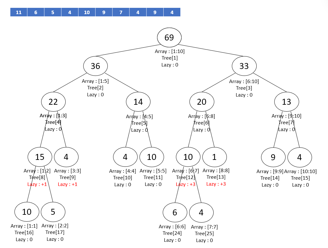 lazy 값은 기존에 업데이트했을 때 누적된 lazy 값에 누적된다. ( +3을 업데이트하고 -3을 업데이트하면 lazy 값이 0이 되므로 아무런 변화가 일어나지 않는 것처럼, 특정 구간에 여러 번 업데이트가 일어날 때 lazy 값이 누적될 수 있다! )