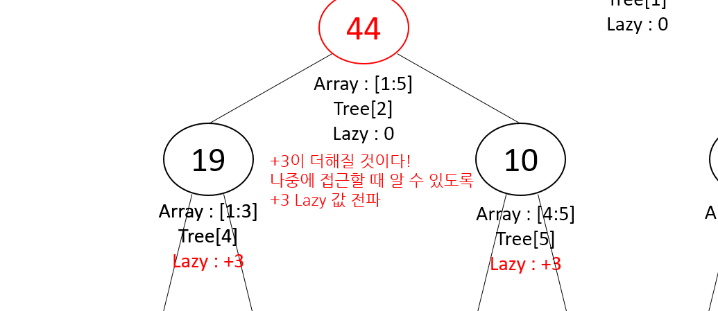 구간 합을 업데이트했다면, 자식 노드까지 업데이트를 진행하지 않아도 나중에 [1:5] 구간의 구간 합을 구할 때 바로 구할 수 있다! 물론 [1:5] 구간만 계속 구하지 않고 [2:5]나 [3:4] 처럼 내부 구간만 구하고 싶을 때도 있기 때문에, 그 부분은 나중에 구하겠다고 하고 Lazy 값을 자식 노드에게 전달한다.