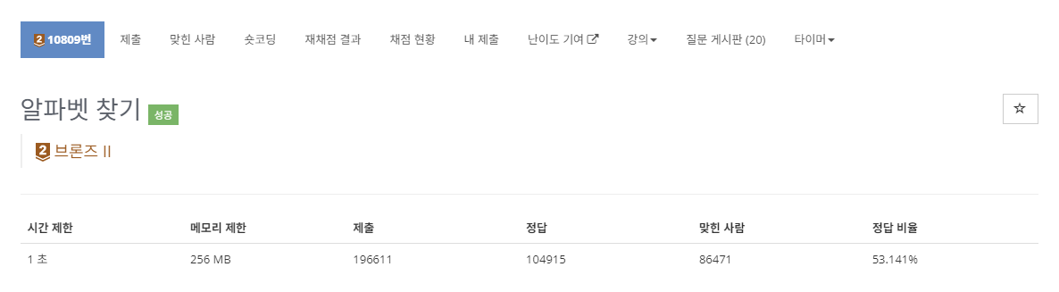 만약, 어떤 알파벳이 단어에 포함되어 있지 않다면 -1을 출력한다. 단어의 첫 번째 글자는 0번째 위치이고, 두 번째 글자는 1번째 위치이다.