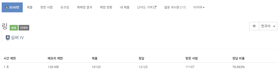첫 번째 링이 돌아간 둘레 : 16 / 첫 번째 링의 둘레 : 16 / -> 16/16 -> 1/1바퀴 (1바퀴)